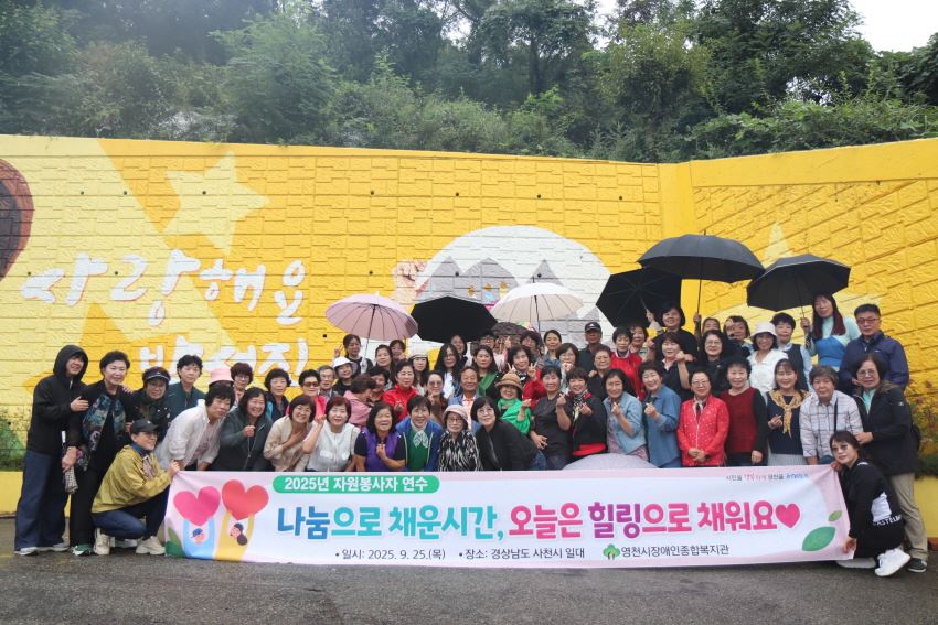 2025년 자원봉사자 연수 실시 박경희 0 154 09.26 16:28 ■ 일시: 2025.9.25.(목) 7:40~19:30■ 장소: 경남 사천일대■ 대상: 자원봉사자 60명■ 내용: 자원봉사자 간 화합과 소속감을 도모하기 위한 연수 실시※ 금일 2025년 자원봉사자 연수에 참여해주셔서 감사합니다.