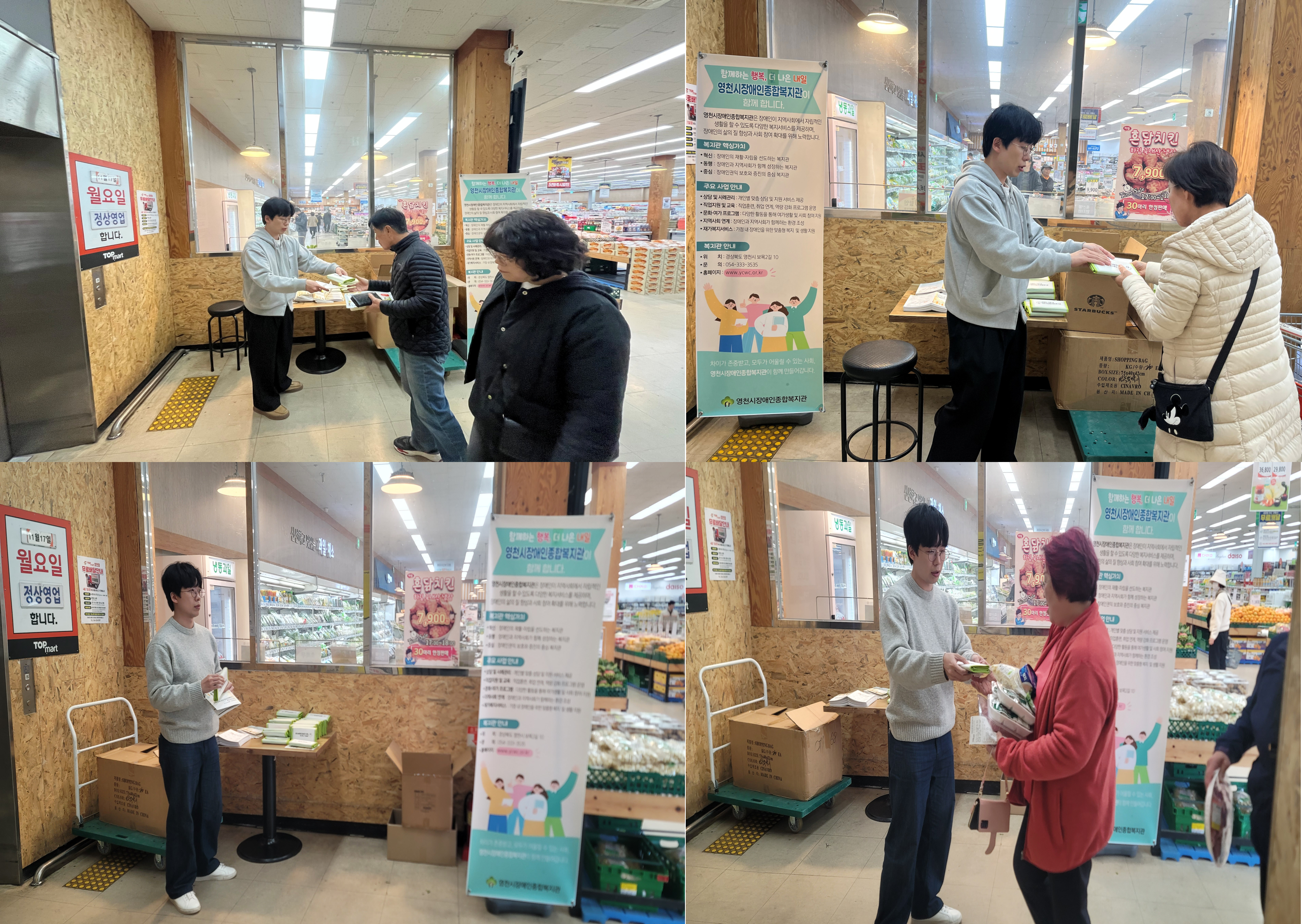 2025년 2차 지역 내 홍보 실시 이상효 0 30 14시간전 ■ 일시: 2025. 11. 12.(수) 17:00~19:00 / 11. 13.(목) 15:00~17:00■ 장소: 탑마트 영천점■ 대상: 지역주민 300명 ■ 내용: 복지관 안내문 및 기념품 배부를 통한 지역 내 홍보활동